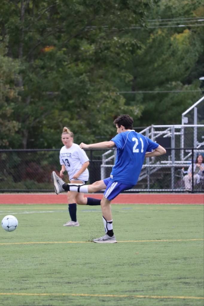 Coming into the second half of the game, the Bobcats weren’t ready to back down. “When it was just zero to zero, there wasn’t as much competition because there was nothing on the line, but once they were already two points ahead, it started getting risky so we definitely got more determined,” explains Doherty. This newfound motivation helped the Bobcats clean up their passing and move the ball more easily down the field, allowing for more opportunities to score some goals. With the help of partner Tommy Fogg (‘24), player Mitchell Warden (‘23), was able to score, further closing the gap between Exeter and Oyster River.