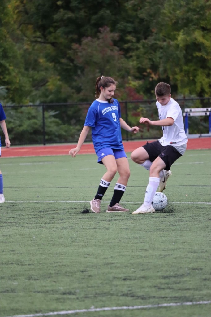 The team had high expectations about Exeter’s athletes and knew it would be a challenging game. “In the beginning, we were a little frazzled on the offensive,” explains partner Abby Deane (‘23). Unable to pass the ball effectively, Oyster River found it difficult to match up to Exeter who came out of the gate as a strong offensive team. Many of their passes were intercepted, allowing Exeter to edge ahead and score two goals within the last ten minutes of the first half.