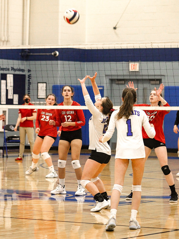 The game started off with Coe-Brown scoring the first point. Coe-Brown won the first set 25-19. Oyster River came back and won the second set 25-23. Coe-Brown won the third set 25-18. And finally, after a tough battle, Coe-Brown won the fourth set, winning 30-28 and winning the game. Coe-Brown was a good serving team with hard and fast serves that were difficult for Oyster River to receive the ball and set up a good offense. The fourth set was well played. The rallies were very long and both teams hustled to keep the ball in play. It ended with the last couple of points back-to-back from both teams, but Coe-Brown was able to take the lead and the win home. “I think one of the things we did best is that we stayed positive. That’s one thing that we’ve always done really well and we’ve always pushed each other really hard,” says Josie Malloy (‘23), rightside hitter from Coe-Brown.