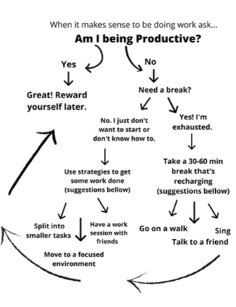 When it’s a time that you just don’t want to do work that you should be doing, some students and I have some strategies to go about that. One big thing is to just make a plan on when you are going to complete things and break the assignments into specific steps. That way it’s often less stressful and on-task. Other students mentioned strategies like putting yourself in a productive work space, breaking up time with 5-minute breaks, dressing up nice, working with friends, or pretending that this task has more weight than it really does at the moment. Sometimes the small tasks that need to be done over time just seem so minor but when they add up to a short period of time they aren’t as minor anymore. Splitting in in smaller chunks allows for better ability to focus and make each part of completing a project have more quality. Some of these strategies are helpful for some students but not others. It’s important to find what works for you and reward yourself with longer breaks that are meaningful to you when you complete your work.