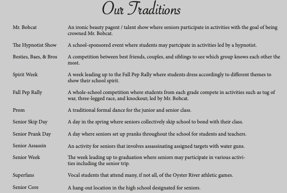 I can say with certainty that the highlights of my freshman and sophomore years were the memories I made with friends at some of Oyster River High School’s most anticipated events and traditions. I remember being infatuated with the Bobcat pride and passion that the class of 2019 and 2020 seemed to bleed, and it made me excited to participate in every opportunity to show my own school spirit. Typically, this is how it works: Underclassmen learn the high school traditions by observing the upperclassmen. However, after COVID-19 sealed us out of the building for several years, the class of 2022 are the only current students who have had the opportunity to experience an entire year of normal traditions in the high school. What even are the traditions that I’m talking about and why is it important to continue and preserve them?