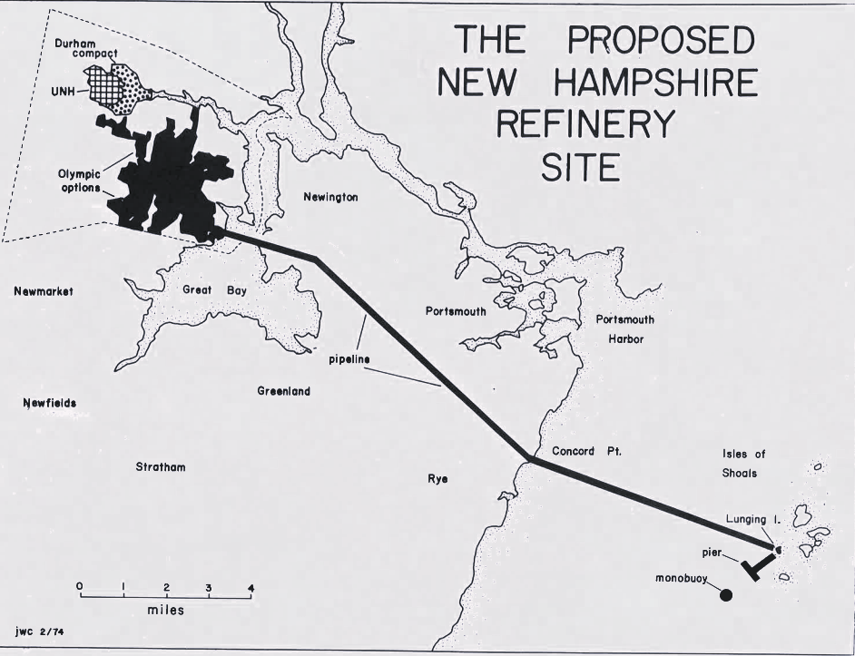 Their plan was to buy up a lot of land in the area. To get the oil to the refinery, there would be a long pipeline from the Isles of Shoals, through Rye and Newington, finally reaching Durham. As more and more land got purchased, however, people noticed. One day in the summer of 1973, Dudley received a phone call. “I answered it, and it was a friend of mine that I had met in the legislature, and she said […] ‘Haven’t you heard? There’s a huge development going to happen, and it doesn’t sound good,’” she said.