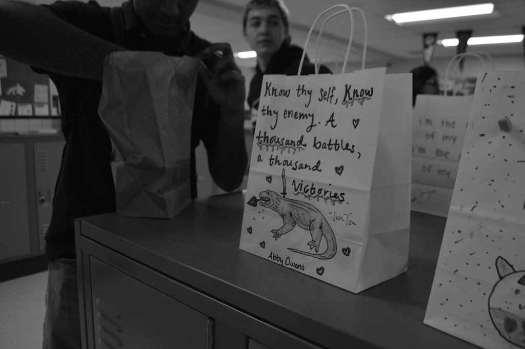His bag was decorated early during advisory on Friday, February 9th, in what Cam Monette (’24) has deemed an accurate representation of his personality (it has a tiger inside of a jungle drawn on it). Monette’s bag had a shark on it, and read, “There’s always a bigger fish.” Needless to say, the craft was a source of creative inspiration for many seniors.