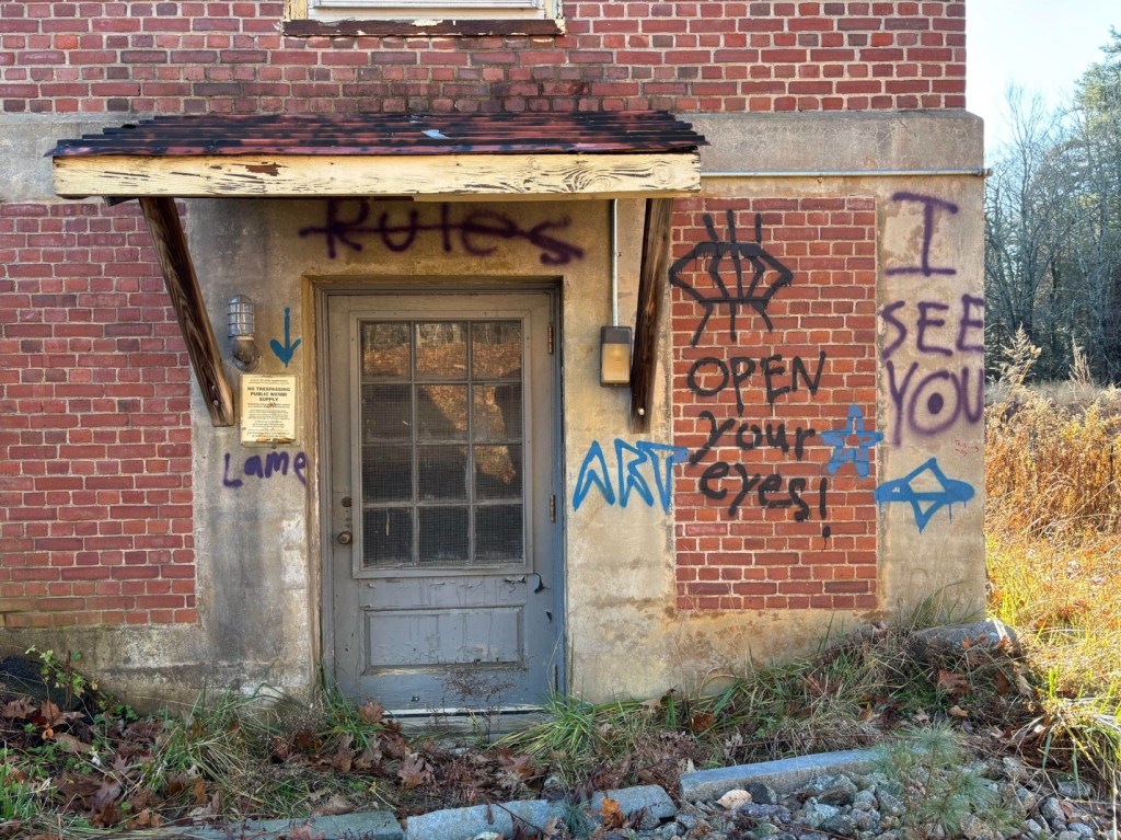 Graffiti covered this place. While oftentimes graffiti is seen as an art form, at its core it’s vandalism. Crude drawings, slurs, and several different depictions of male genitilia were plastered across these buildings.