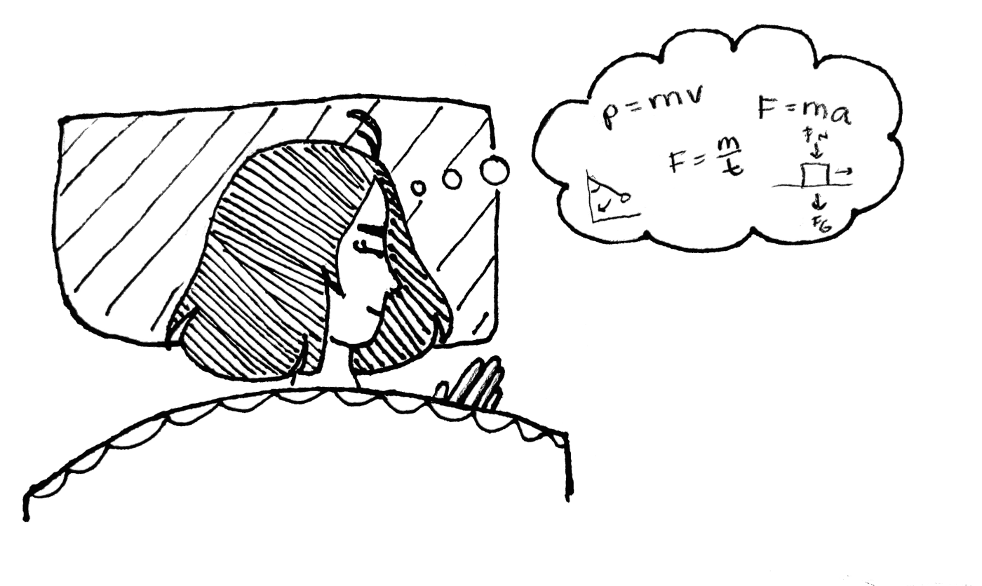 As Maya More (‘25) falls asleep, she thinks of physics. Force, momentum….if momentum is mass times velocity, and force is mass times acceleration… is force just momentum over time??