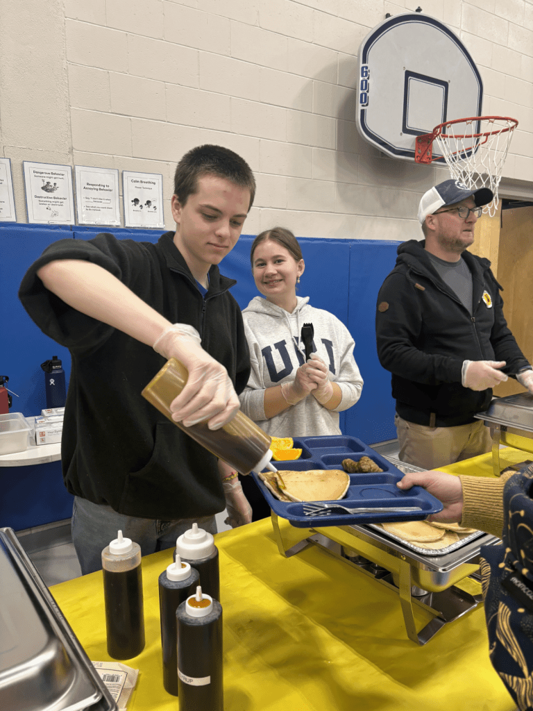 Luke Sullivan (‘25), one of the NHS volunteers, suggested I take a picture of him pouring syrup. Grace Palmer (‘25) paused from serving pancakes to smile next to him.